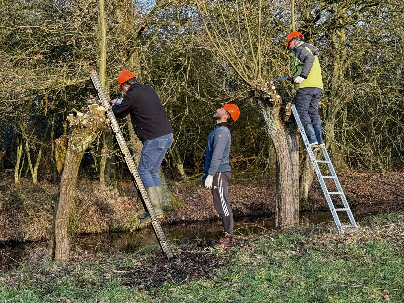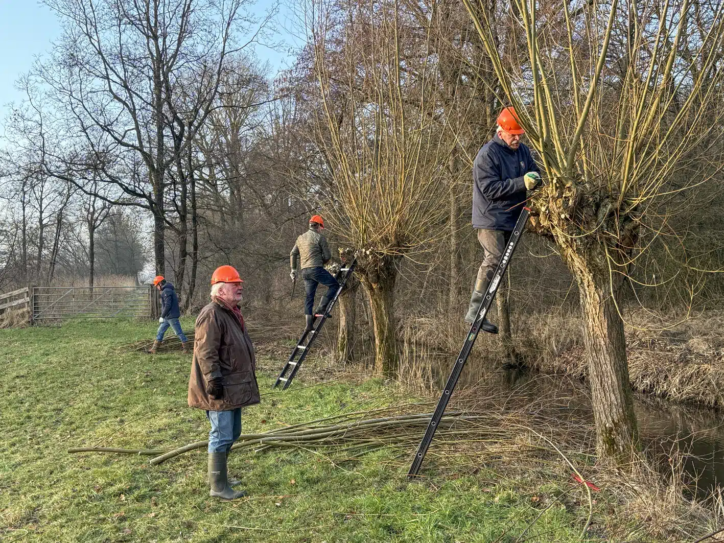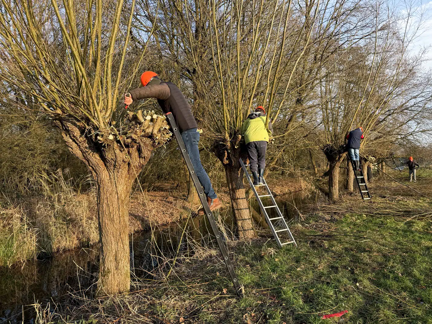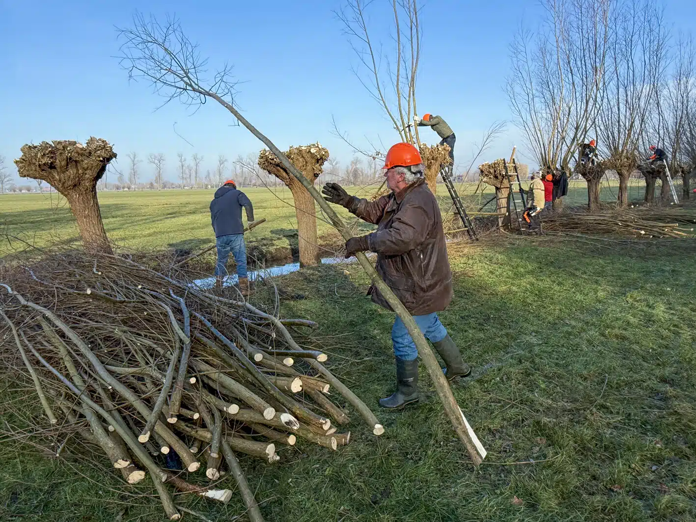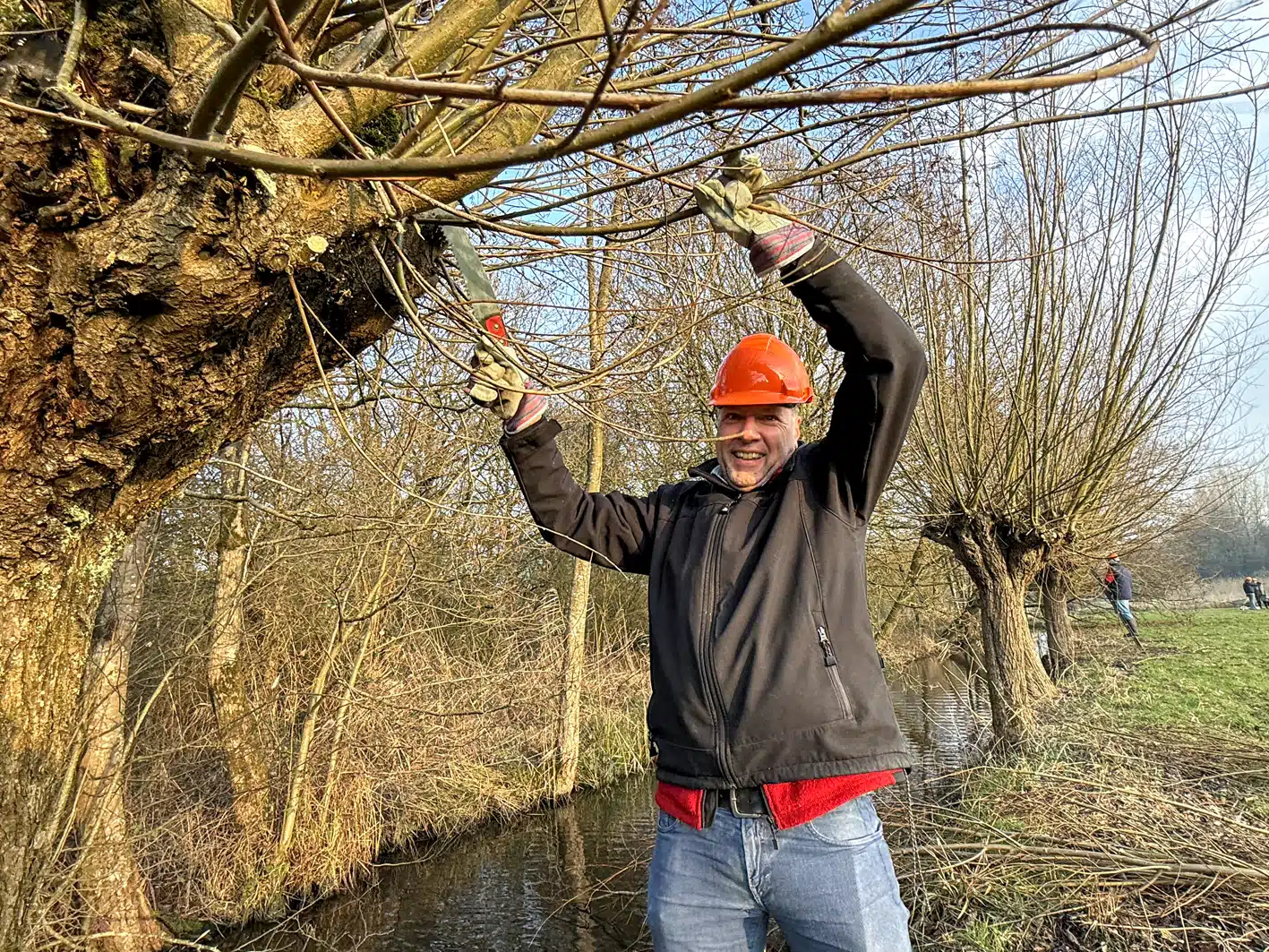 Een heel flinke rij knotwilgen is weer bevrijd van hun takken. Op de groepsfoto kun je tellen met hoeveel man we waren.