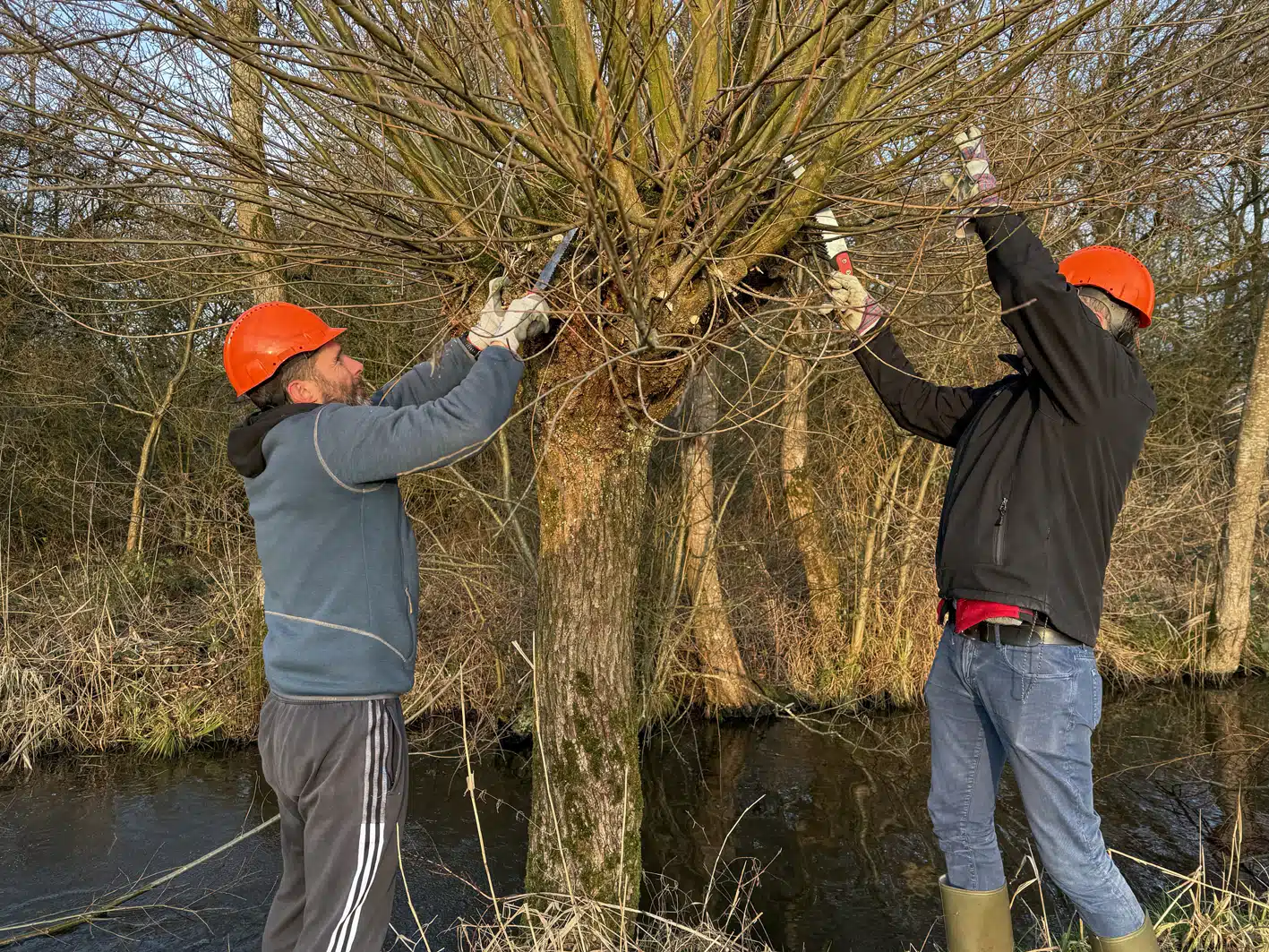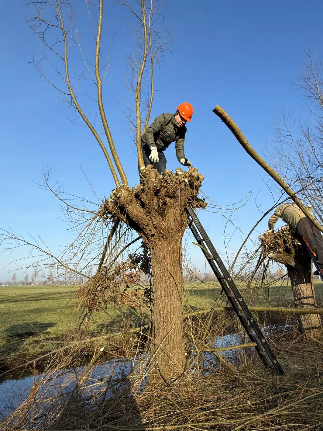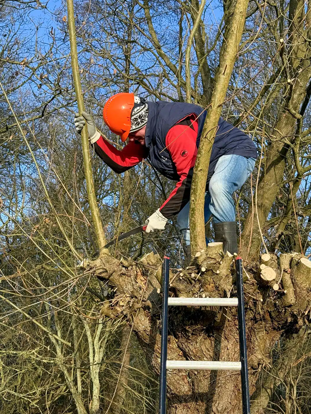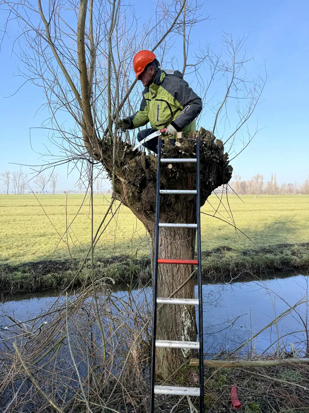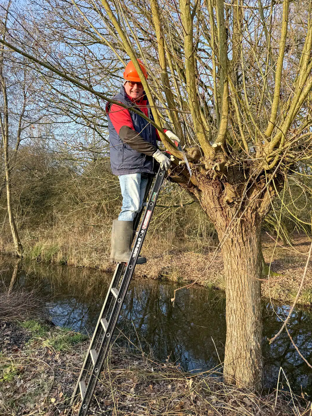Een heel flinke rij knotwilgen is weer bevrijd van hun takken. Op de groepsfoto kun je tellen met hoeveel man we waren.