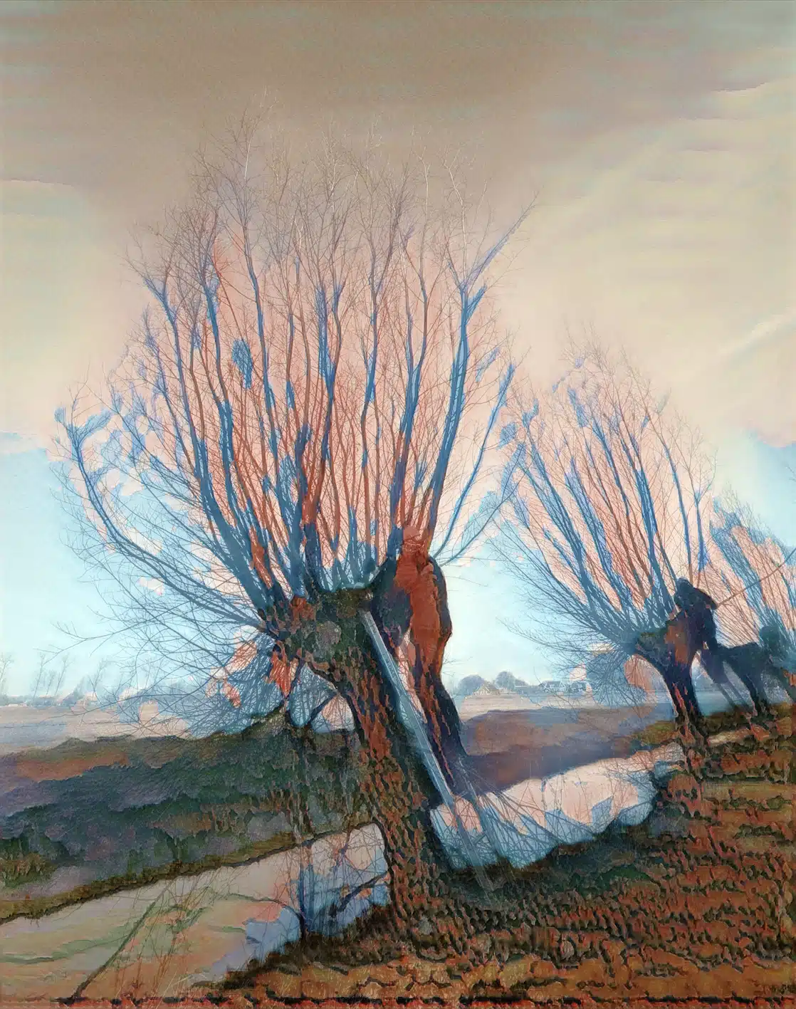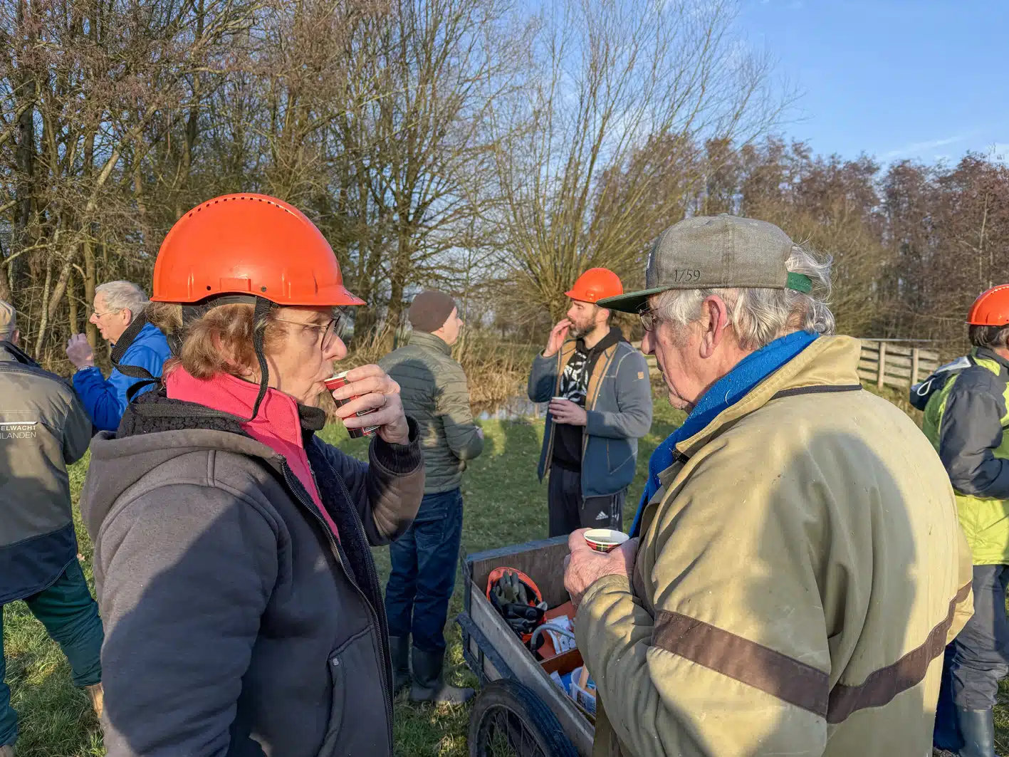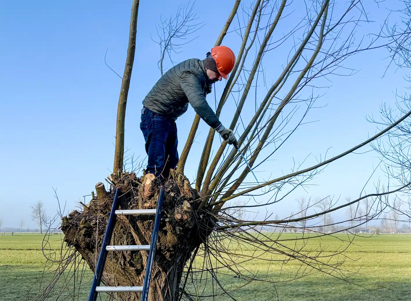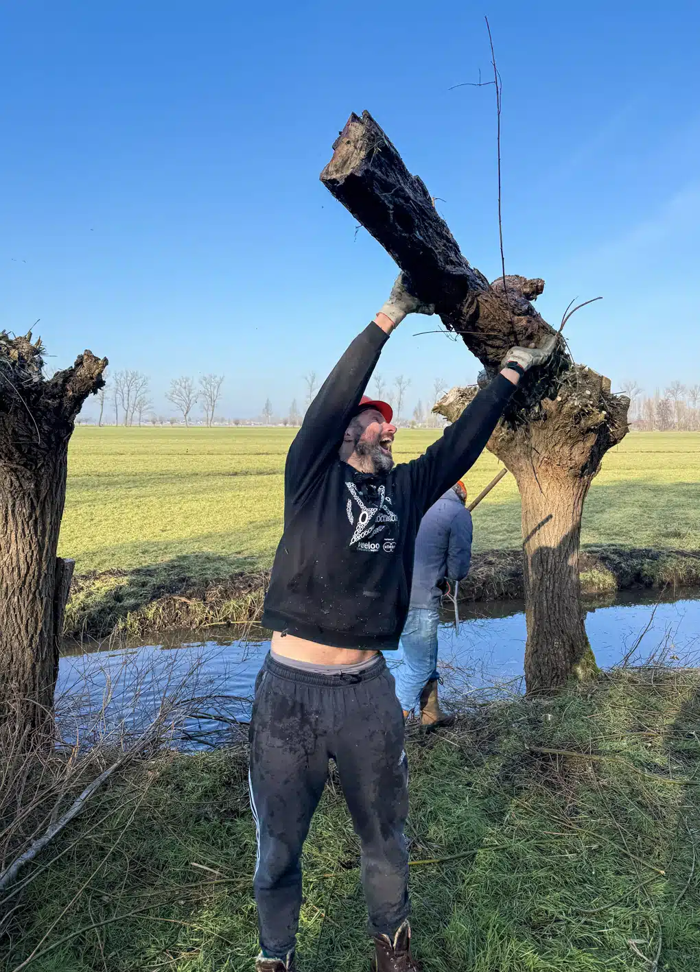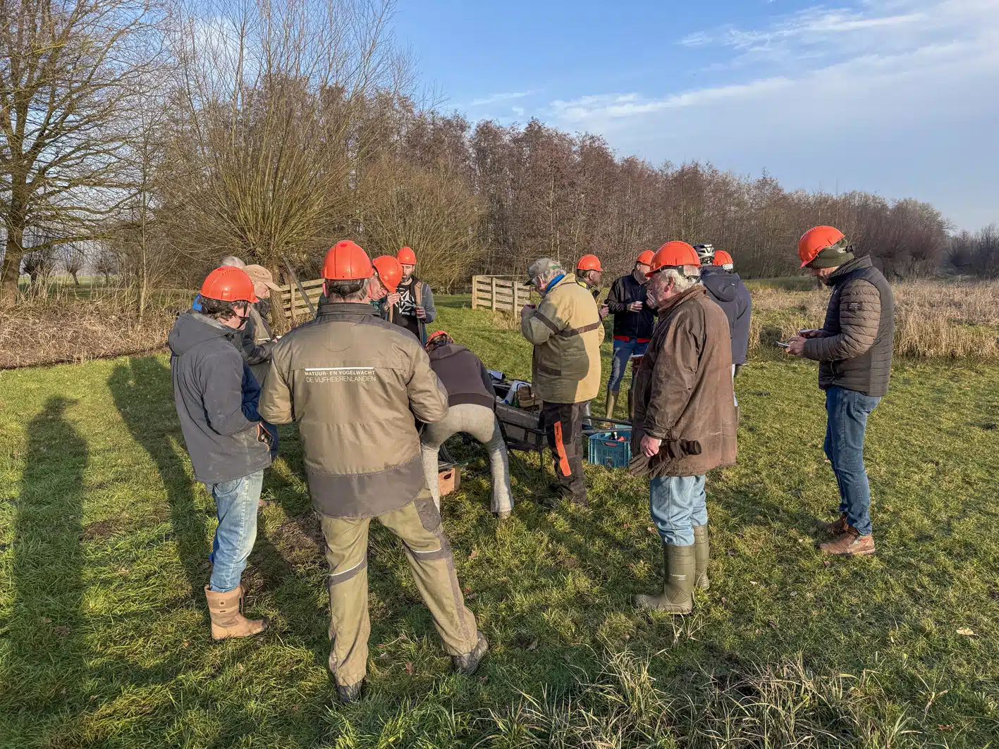 Een heel flinke rij knotwilgen is weer bevrijd van hun takken. Op de groepsfoto kun je tellen met hoeveel man we waren.