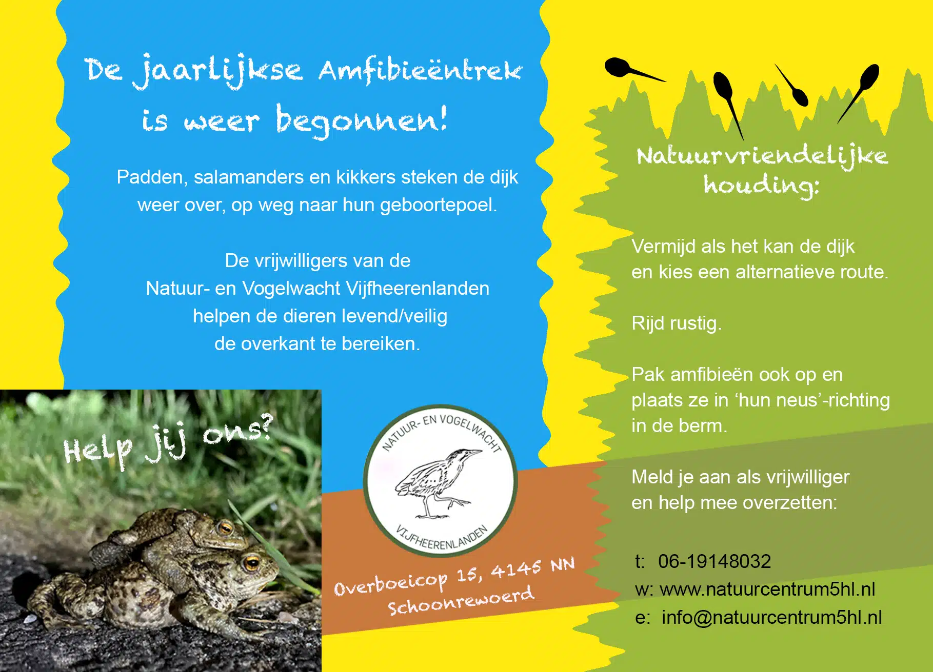 Onze werkgroep houdt zich voornamelijk bezig met het beschermen van amfibieën (kikkers, padden, kamsalamanders en kleine watersalamanders) tijdens de trek naar hun voortplantingsplaatsen.